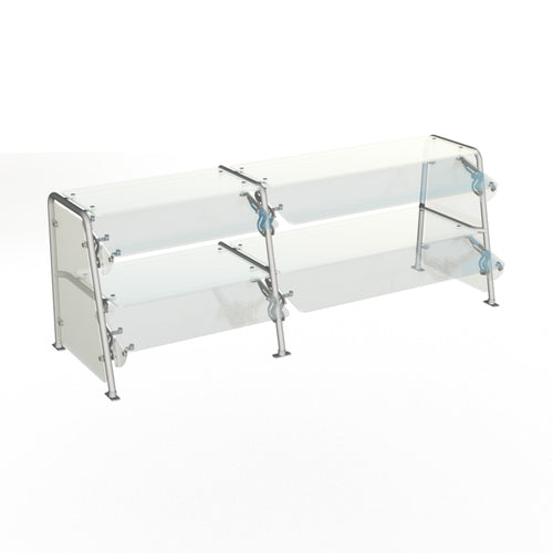 Contemporary Food Shield, 73-1/2"W x 20"D x 26-1/8"H, adjustable from full-service to self-service guard, dual shelves, sloped guard with fixed end closures, 3/8" glass overshelf & guard with 1/4" glass ends (tempered with polished rounded edges), sloped Ø 1" tube posts, stainless steel finish posts mounted through countertop with mounting flange