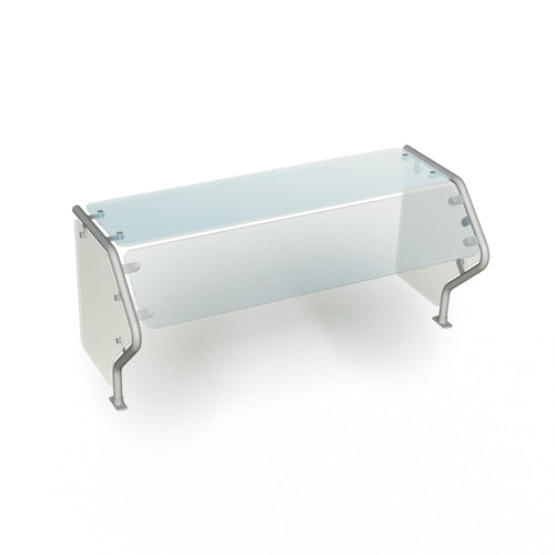 Contemporary Food Shield, 31-1/2"W x 18-1/2"D x 20-1/8"H, self-service, single shelf, sloped fixed guard with fixed end closures, 3/8" glass overshelf & guard with 1/4" glass ends (tempered with polished rounded edges), Ø 1" tube posts, stainless steel finish posts mounted through countertop with mounting flange