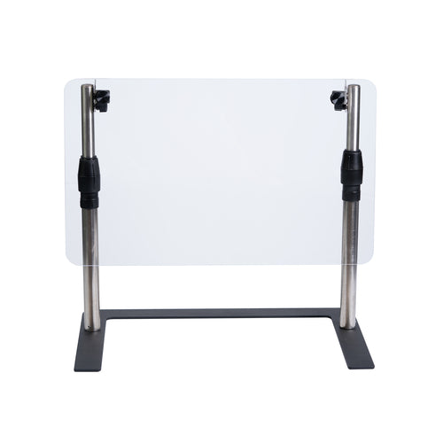 24" Mobile Countertop Breathguard, sized for standard banquet tables, work with most warmers, chafers & buffet service pieces, easy to assemble, adjustable flat acrylic panel, stainless poles with molded adjustment knob for heights from 14-1/4" to 25-1/4", Iron Powder Coated base, shipped knocked down, replacement parts available, Made in USA