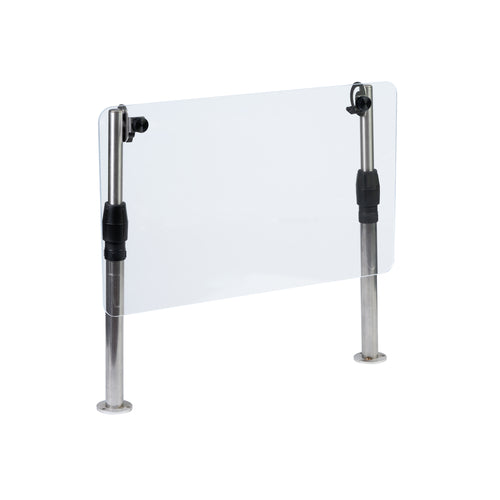 24" Mounting Countertop Breathguard, sized for standard banquet tables, work with most warmers, chafers & buffet service pieces, easy to assemble, adjustable flat acrylic panel, stainless poles with molded adjustment knob for heights from 14-1/4" to 25-1/4", Iron Powder Coated base, shipped knocked down, replacement parts available, Made in USA