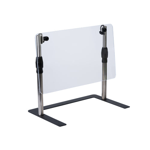 60" Mobile Countertop Breathguard, sized for standard banquet tables, work with most warmers, chafers & buffet service pieces, easy to assemble, adjustable flat acrylic panel, stainless poles with molded adjustment knob for heights from 14-1/4" to 25-1/4", Iron Powder Coated base, shipped knocked down, replacement parts available, Made in USA
