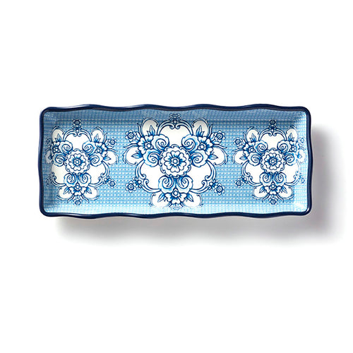 Platter, 14"L x 5-5/8"W x 1-1/4"H, rectangular, BPA free, melamine, Isabella, blue & white pattern, NSF