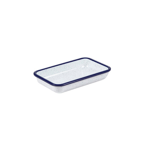 Endurance™ Platter, 6-7/8"L x 4-1/4"W x 1-1/8"H, rectangular, break-resistant, dishwasher safe, melamine, white with blue speckles, blue rim