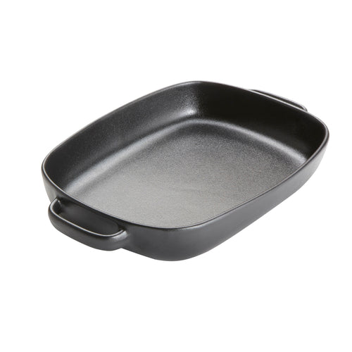 Casserole, 64 oz. (1.9 liter), 11-3/4"L x 9"W x 2"H, 13-1/2"L with handles, rectangular, porcelain, black, matte finish