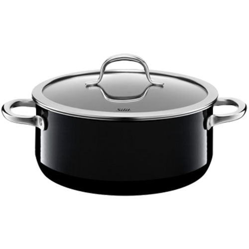 Low Casserole, 4.65 qt. (148.78 oz.), 9-7/16" dia. x 4-1/8"H, round, with glass lid, riveted stainless steel hollow handles, gas/electric/induction/oven safe, dishwasher safe, steel with Silargan® coating, passion black, Passion by Silit
