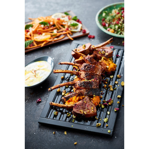 Stave Collection Platter, GN 1/4 size, 10-1/2"L x 6-1/2"W x 1/2"H, rectangular, grill effect, anti-slip silicone feet, chip and stain resistant, dishwasher safe, melamine, black, Dalebrook