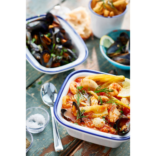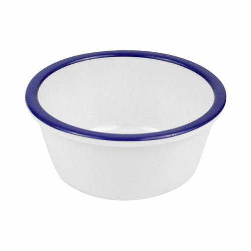 Enamelware Collection Sauce Pot, 4-1/2 oz., 3-1/2" dia. x 1-1/2"H, round, blue rim, anti-slip silicone feet, chip and stain resistant, dishwasher safe, melamine, white, Dalebrook