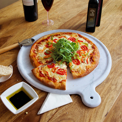 Carrara Collection Marble Platter, 15" x 12-1/2" x 1/2"H, round, with handle, chip and stain resistant, dishwasher safe, melamine, white, Dalebrook
