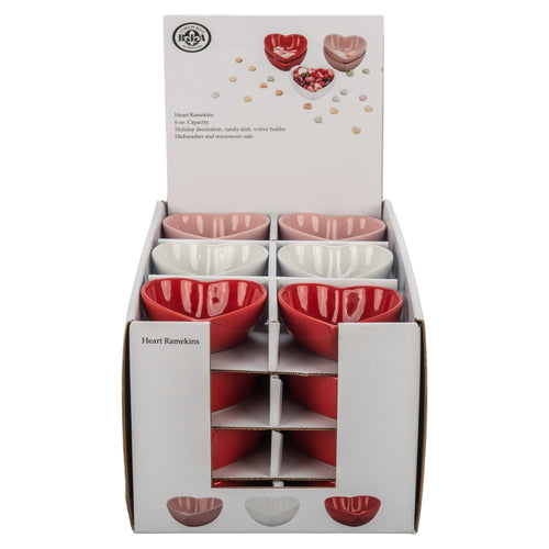 BIA Cordon Bleu® Heart Ramekin, 6 oz., 4-1/2"L x 4"W x 1-1/2"H, heart shape, dishwasher/microwave/oven safe, stoneware (ceramic) (CDU 24 pack, assorted colors: red, white, pink) (NET)