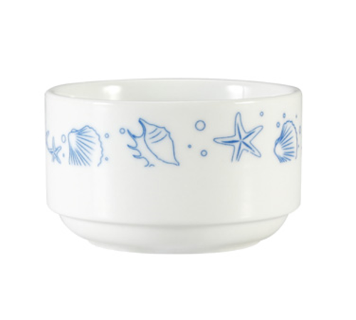 Atlantic Seashell Bouillon Cup, 12 oz., 4" dia. x 2-3/8"H, round, stacking, dishwasher, oven, and microwave safe, porcelain, Blue decorated Rim/Super White (Sold by case)