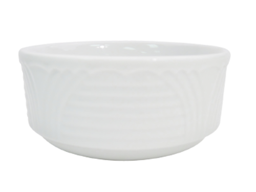 Corona Bouillon Cup, 7-1/2 oz., 4-3/8" dia. x 2"H, round, stackable, embossed, dishwasher, oven and microwave safe, porcelain, Super White (Sold by case)