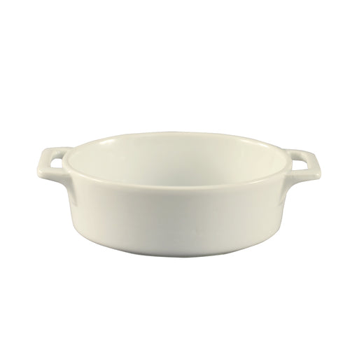 RCN Specialty Gourmet Jar, 12 oz., 6-1/2"L x 4-1/2"W x 2"H, oval, with 2 handles, with lid, dishwasher, oven and microwave safe, porcelain, Super White (Sold by case)