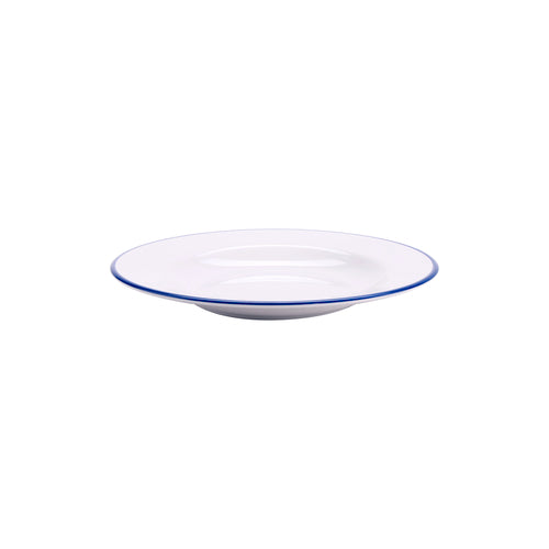 Settlement Bistro™ Enamelware Bowl, 24 oz. (28 oz. rim-full), 11" x 1-1/4", dishwasher safe, melamine, white with cobalt blue trim, NSF, BPA Free