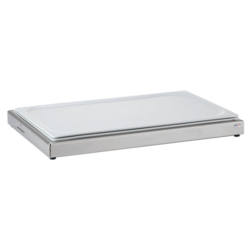 Frilich® Unison Cold Food Display Set, 21-3/5"W x 13-7/10"D x 2-1/5"H, rectangular, includes: white china plate, (6) cooling packs, plastic inset tray, stainless steel base