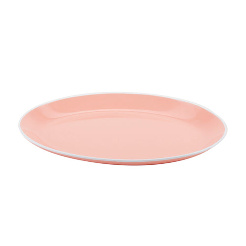 Settlement™ Oasis™ Dinner Plate, small, 10"L x 7-3/4"W, oval, coupe, break-resistant, dishwasher safe, BPA Free, melamine, grapefruit pink with white trim, NSF