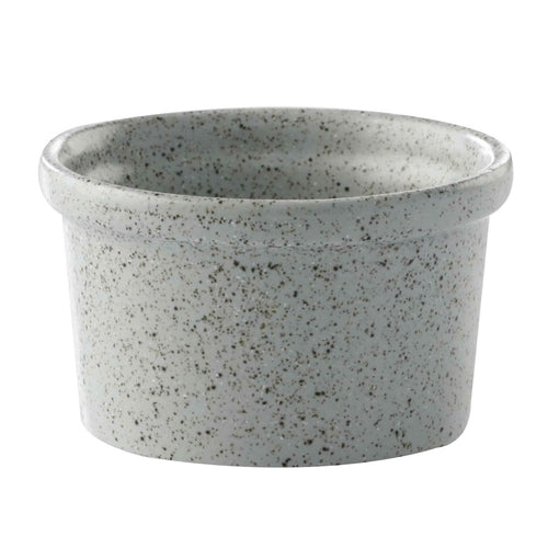 Ramekin, 3.4 oz., 3" dia., small, round, rolled edge, scratch/chip resistant, microwave, dishwasher & oven safe up to 380°F, porcelain, Corona, Cosmos Moon, speckled grey reactive glaze (Made to Order item- 6 to 8 weeks lead time, minimum order = case quantity)