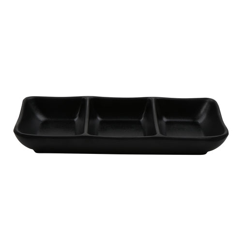 Nara™ Sauce/Appetizer Dish, 5-1/2 oz. (6 oz. rim-full), 7-3/4" x 3-1/4" x 3/4"H, 3-compartment, rectangular, break-resistant, dishwasher safe, BPA Free, melamine, black, NSF
