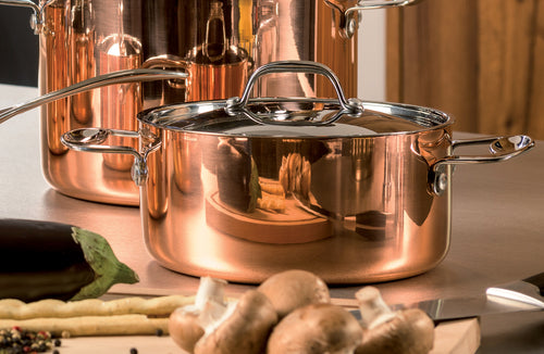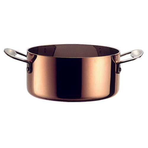Casserole, 3-11/16 qt. (3-1/2 liter), 9-1/2" dia. x 4"H, round, with (2) riveted handles, includes lid, safe for electric/gas/halogen/ceramic/oven, dishwasher safe (hand wash recommended), tri-ply: copper exterior, aluminum core, 18/10 stainless steel interior, Toscana