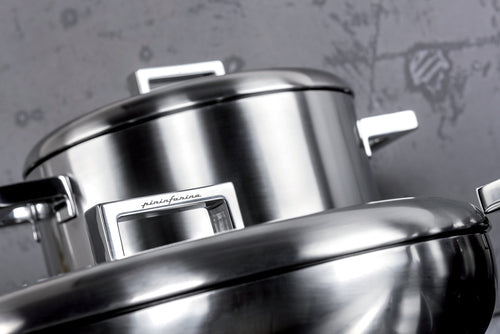 Casserole, 5-15/16 qt. (5-3/5 liter), 9-7/16" dia. x 5-1/3"H, round, 2 handles, heat-diffusing bottom with elevated thickness, ergonomic, hollow, welded, heat-resistant handles, dishwasher safe, induction/gas/electric/halogen/oven safe, 18/10 stainless steel, external matte finish, glossy-matte handle finish, STILE by Pininfarina