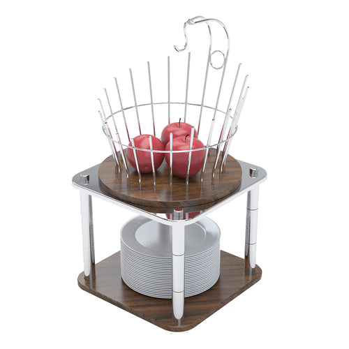 Domino Fruit Basket Stand Set, 14”L x 14”W x 25-3/4”, includes: medium 7" dish stand, fruit basket with stainless steel banana hook, wood bottom, 18/10 stainless steel (shipped in multiple boxes)