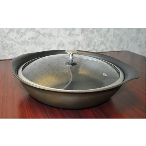 Motif Casserole Pan, 3-3/4 qt., 12" dia. x 3-1/4" deep, divided, round, with tempered glass cover, Teflon® non-stick and QuanTanium® interior, coated stainless steel induction base, two-ply exterior, constructed of cast aluminum with ceramic reinforced finish, bronze
