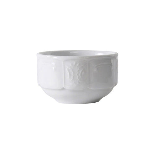 Bouillon, 11 oz., 4-1/4" dia. x 2-1/4" H, round, stackable, embossed, microwave & dishwasher safe, oven proof, fully vitrified, lead-free, Chicago, Porcelain White