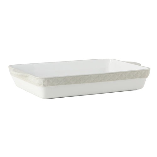 Casserole Dish, 6-1/4 qt., 18-1/2"L x 11"W x 3"H (16-1/2"L without handle), rectangular, without lid, embossed, microwave & dishwasher safe, oven proof, fully vitrified, lead-free, DisplayTux®©, Porcelain White with White Truffle Band