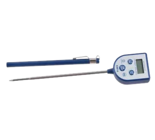 Pocket Thermometer, digital, -4° to 400°F (-20° to 200°C) temperature range, ± 2°F accuracy), 5" long, anti-microbial, auto power-off, data hold button, waterproof, field calibratable, dishwasher safe, 1.5V (LR44) battery, pocket holder, plastic, blue, NSF (KM14)