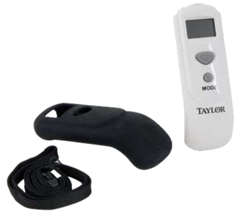 Thermometer, infrared, 4-7/16" x 1-1/2", 9/16" x 7/8"LCD display, -67° to 428° F (-55° to 220° C) switchable temperature range, 3v battery included, rubber boot, strap, minimum/maximum and lock function, non-contact measurement, white, plastic