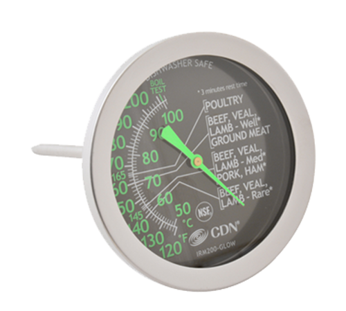 Thermometer, meat/poultry, 4-5/8" probe, 5-1/2" overall length, 2" dial face, 120° to 200° F (50° to 93° C) temperature range, easy to read in low light conditions marking glow in the dark, water proof, oven proof, durable glass lens, dishwasher safe, stainless steel, NSF