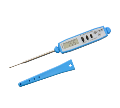 Thermometer, digital, blue, 2-3/4" stem, 6-1/4" overall length, -40° to 450° F (-40° to 230° C) temperature range, 1.5v battery, pocket clip, hook, water proof, antimicrobial, food safe, field calibration, shatterproof, plastic, stainless steel stem, NSF