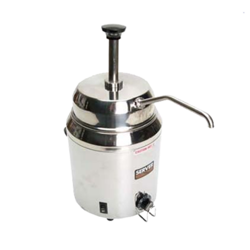 FSP Fudge Server with Pump, stainless steel water-bath warmer dispenses directly from 3 quart (2.8 L) stainless steel jar (94009) or food manufacturer’s #10 can, pump yields 1 oz. (30 ml) with collars provided to reduce yield in 1/8 oz. (3.7 ml) increments, when dispensing potentially hazardous foods, a spout warmer is required, jar not included, (500 watt, 120v), NSF, cULus (#82060)
