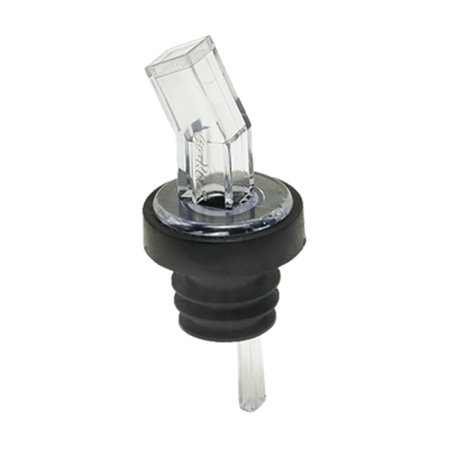 Liquor Pourer, free style, with screen to keep out insects, clear plastic spout, black plastic collar