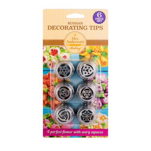 Mrs. Anderson's Baking® Pastry Russian Decorating Tips, 1" top dia. x 1.5" bottom dia., assorted shapes, dishwasher safe, 18/8 stainless steel (set of 6)