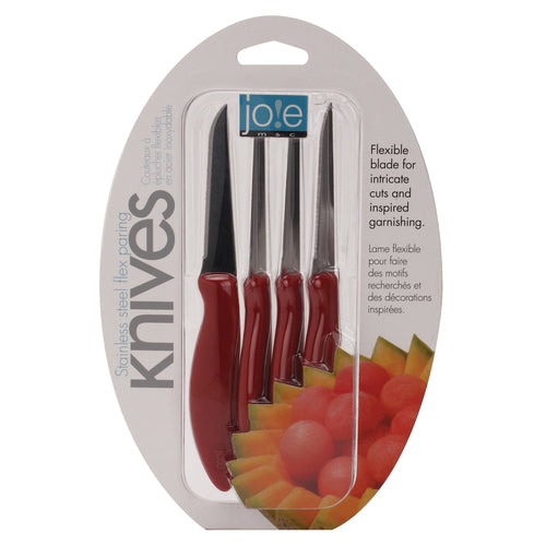 Joie Paring Knives, 6" O.A.L., flexible, stainless steel blades, with plastic handle, assorted colors (4 each per set, contact factory for specific colors included in a master case, colors chosen at random upon shipment) (carded)