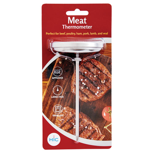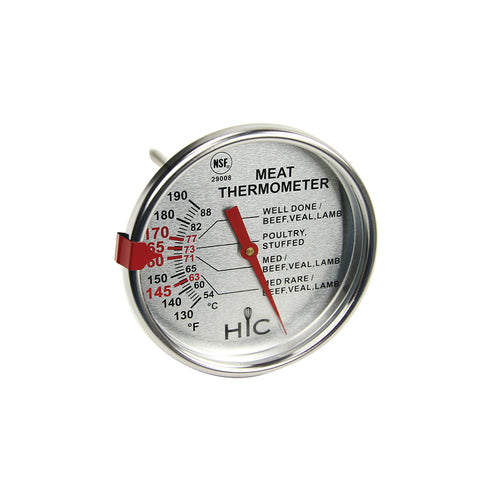 Meat Thermometer, 3" dial display, analog, 130°F to 190°F temperature range, movable red indicator, oven & dishwasher safe, stainless steel, NSF