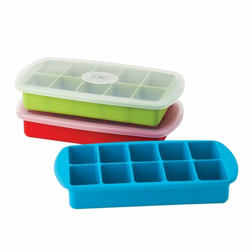 Joie Ice Cube Tray, makes (14) cubes, flip & fill tab, silicone, assorted colors (priced per set, 4 each per set, red, green & blue included in a master case, colors chosen at random upon shipment)