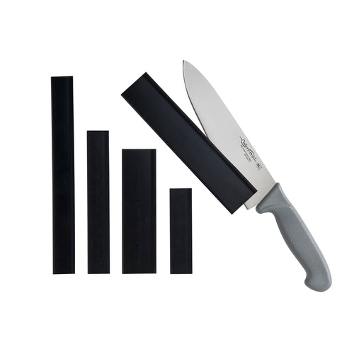 Cutlery-Pro® Blade Guard Set, 5-piece, includes (1) each guards for 4-1/4" paring/tourne, 6" chef/santoku, 7-1/4" utility/fillet, 8" carving/bread, 10" carving/roast/bread, fits stamped, forged & ceramic blades, dishwasher safe, ABS plastic, black