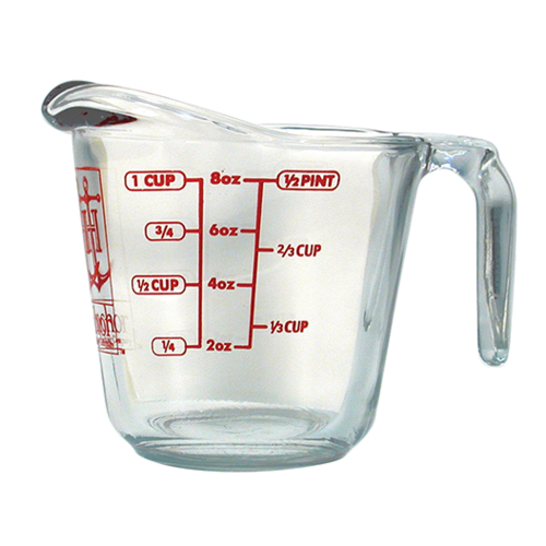 Anchor Hocking Measuring Cup, 8 oz., oven proof glass, fully tempered, red measurements (must be purchased in case quantities)