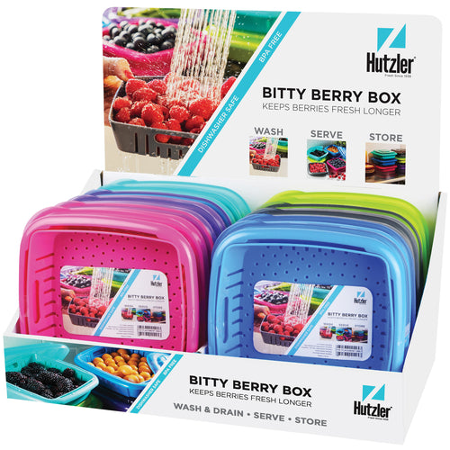 Hutzler® Bitty Berry Box, 6-1/2"L x 6-1/2"L x 2"H, rectangular, dishwasher safe, plastic, assorted colors, BPA free (3 each per set, 12 sets total per display/case)