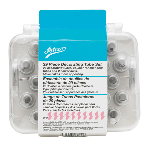 Ateco Cake Decorating Tube Set, variety of shapes, 1 plastic coupling, metal tubes, hinged plastic storage box (set of 26)
