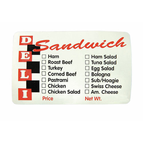 Food Information Label, "Deli Sandwich", 3" x 2", rectangular, check-off boxes, contemporary style, paper, red/black imprinted, white background (500 each per roll)