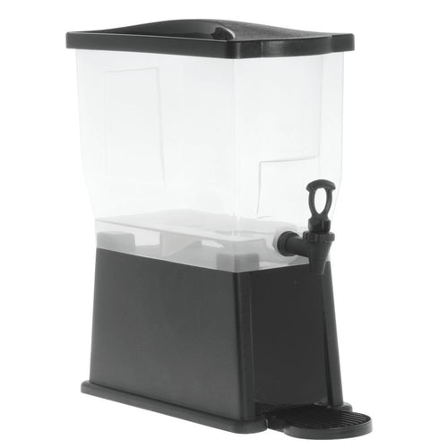Beverage Dispenser, 3-1/2 gallon, 20-1/2" x 8-1/8" x 19"H, rectangular, attachable drip tray, black base, spigot & lid, polypropylene chamber, clear