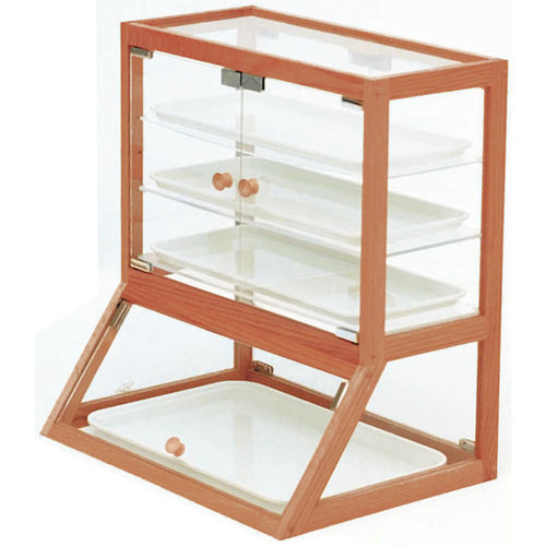 Bakery Display Case, full or self-service, 20-1/4" x 18" x 23"H, rectangular, countertop, (3) fully adjustable shelves, holds (3) 9" x 18" & (1) 13" x 18" trays, (2) front doors, (2) rear doors & (1) bottom lift up door, magnetic door catch, bottomless design, clear tempered glass with brass corners, bamboo wood trim with oak finish