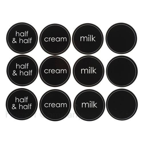 Cold Beverage Cling-It™ Set, 12-piece, 2-1/2" dia., round, includes: (3) cream, (3) half & half, (3) milk & (3) blank, vinyl, black with white imprint