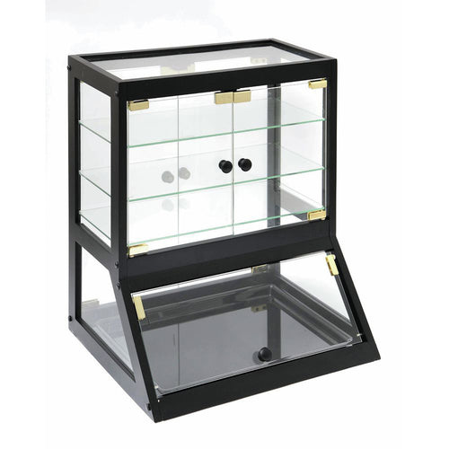 Bakery Display Case, full or self-service, 20-1/4" x 18" x 23"H, rectangular, countertop, (3) fully adjustable shelves, holds (3) 9" x 18" & (1) 13" x 18" trays, (2) front doors, (2) rear doors & (1) bottom lift up door, magnetic door catch, bottomless design, clear tempered glass with brass corners, bamboo wood trim with black finish