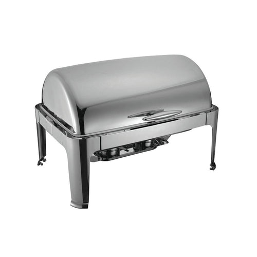 Chafer, full-size, 9-1/2 qt., 25-1/2" x 19-1/2" x 17-1/3"H, rectangular, with water pan, roll-top cover, frame, & fuel cell platform, straight legs, stainless steel, mirror finish