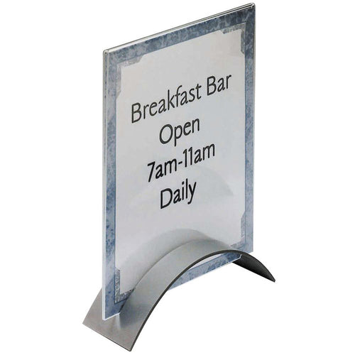 Sign Holder, 8-1/4" x 3"x 12"H overall, holds 8-1/2" x 11"H insert, countertop, clear pocket, dome base, acrylic, silver
