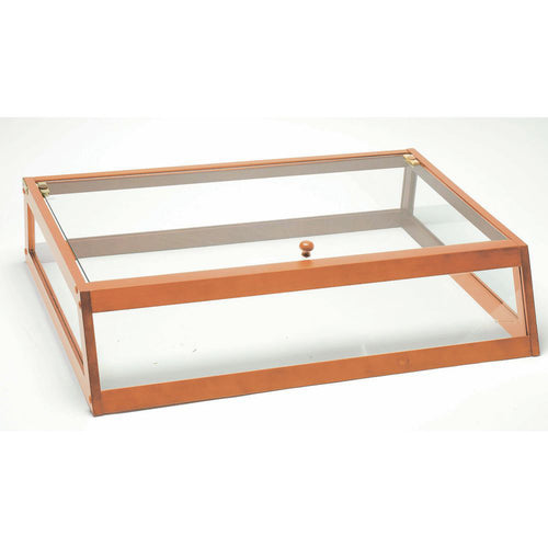 Bakery Display Case, top-serve, 28" x 20" x 8"H, rectangular, tapered, countertop, holds (2) 13" x 18" or (1) 18" x 26" trays, single top door, bottomless design, clear tempered glass with brass corners, bamboo wood trim with oak finish