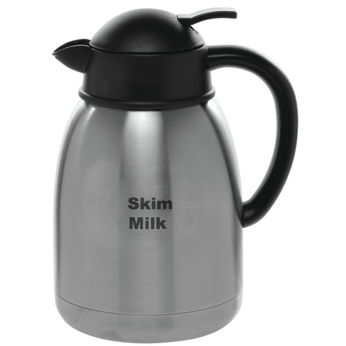 Decanter, "Skim Milk" imprinted, 1-1/2 liter, 7" x 5-1/2" x 10"H, double-wall, retention: 2-3 hours, push-button, black lid, stainless steel, brushed finish